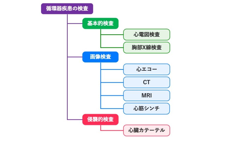 疾患の診断や重症度の判定を行います。 - 循環器検査の主な種類を、以下にまとめます。
