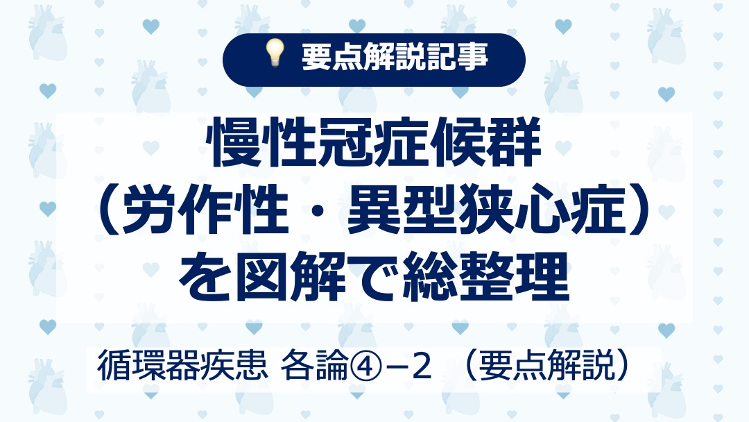 本記事では、慢性冠症候群(労作性狭心症・異型狭心症)について、以下の内容を整理します(クイズは別記事へ)。