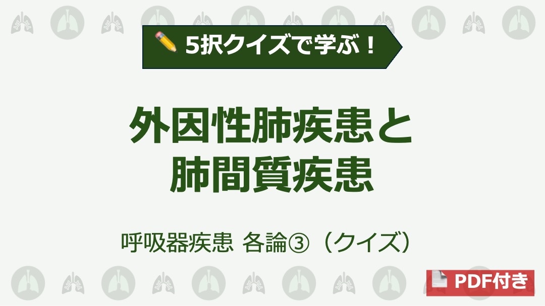本記事は、「解いて覚える」をコンセプトにした 外因性肺疾患と肺間質疾患 の5択クイズ記事です(※詳細な要点解説は別記事にしています)。